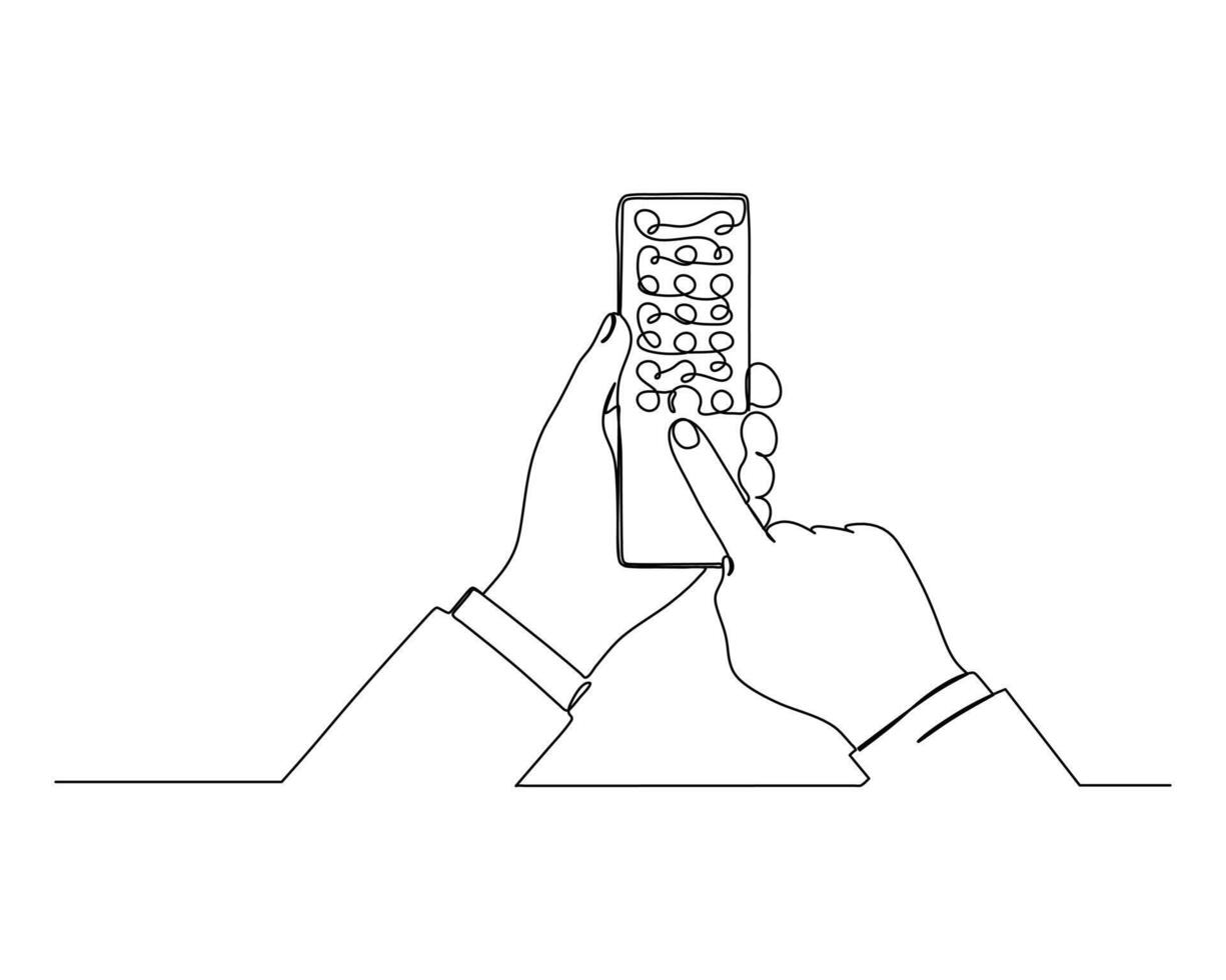 continuous line drawing of two hands holding a remote control and pressing a button. The minimalistic style captures the simplicity and focus of the action Pro Vector