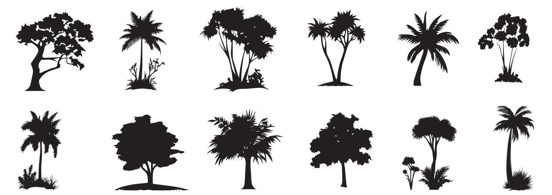 Set tree silhouettes in various styles arranged in rows on a white background. Pro Vector