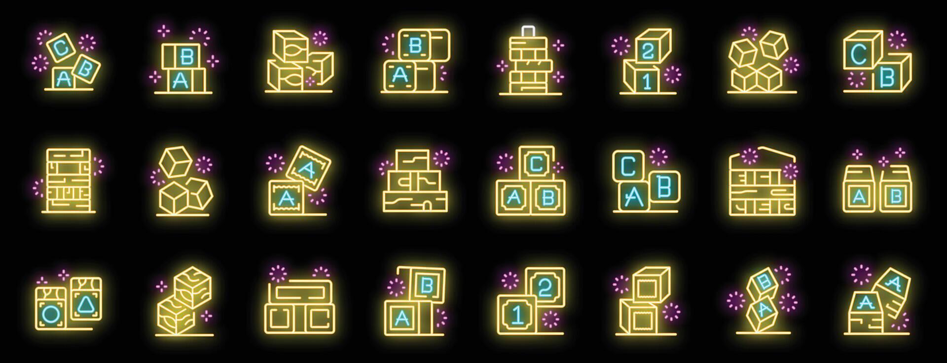Set of neon building blocks icons with letters and numbers Pro Vector