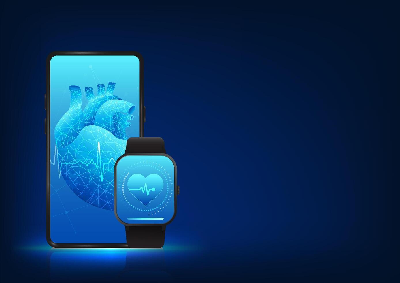 Smart watch technology that connects data to a smartphone that shows heart rate measurements. It is a wristwatch with a heart on the front and a mobile phone that shows the heart rate. Pro Vector