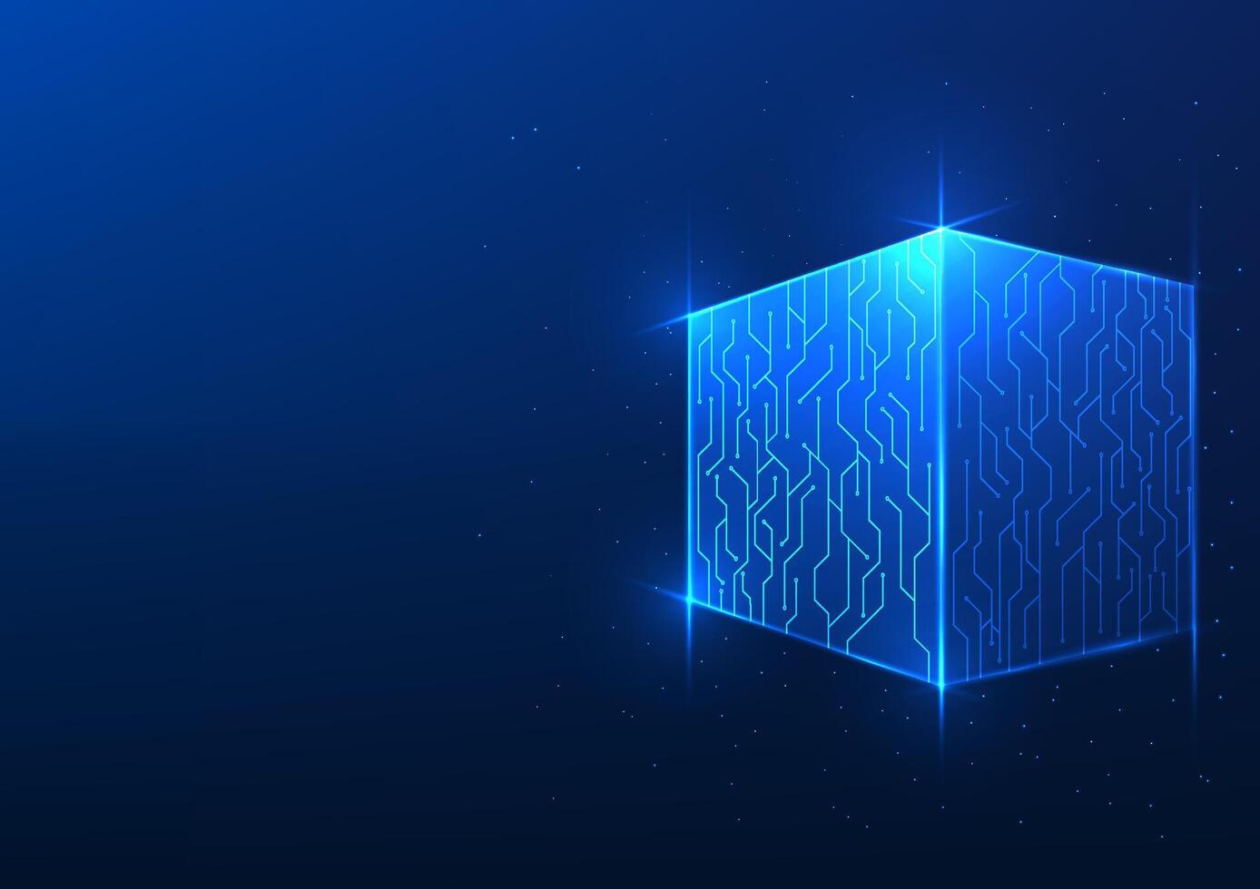 Cube background technology with technology circuits surrounding a square box showing the processing of technology. Illustration, , poster. Pro Vector