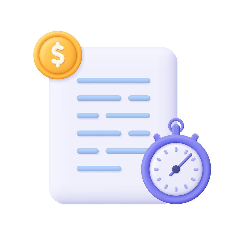 Document sheet with coin and timer. Transaction, time management, accounting and audit concept. 3d icon. Cartoon minimal style. Pro Vector