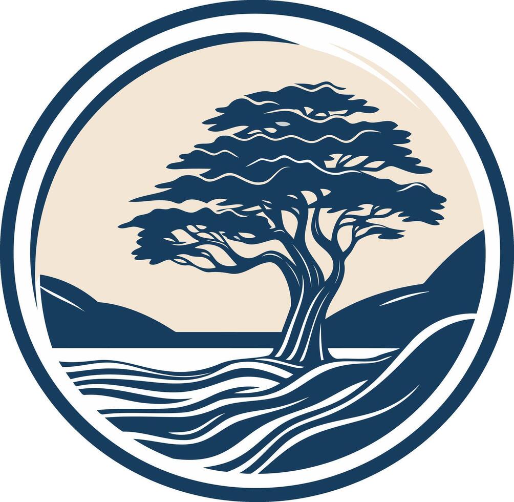 A stylized circular logo featuring a lone tree with twisting branches against a background of rolling hills and waves vector