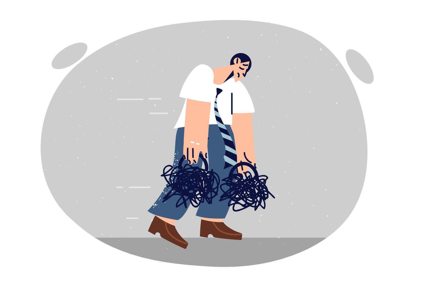 Depressed man with load of problems walks with head down and needs help of psychotherapist Pro Vector
