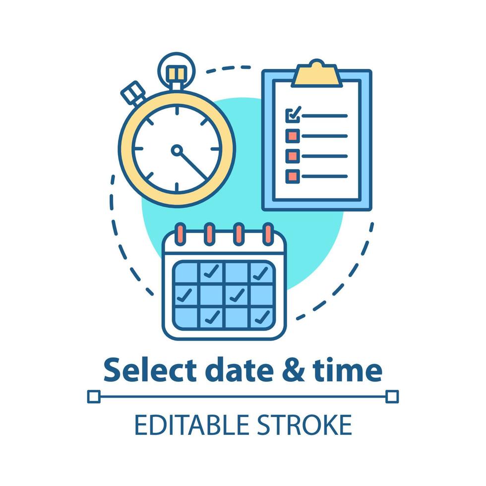 Select date and time concept icon. Choose day thin line illustration. eservation, booking. Time management and scheduling. Calendar and stopwatch. Vector isolated outline drawing. Editable stroke Pro Vector