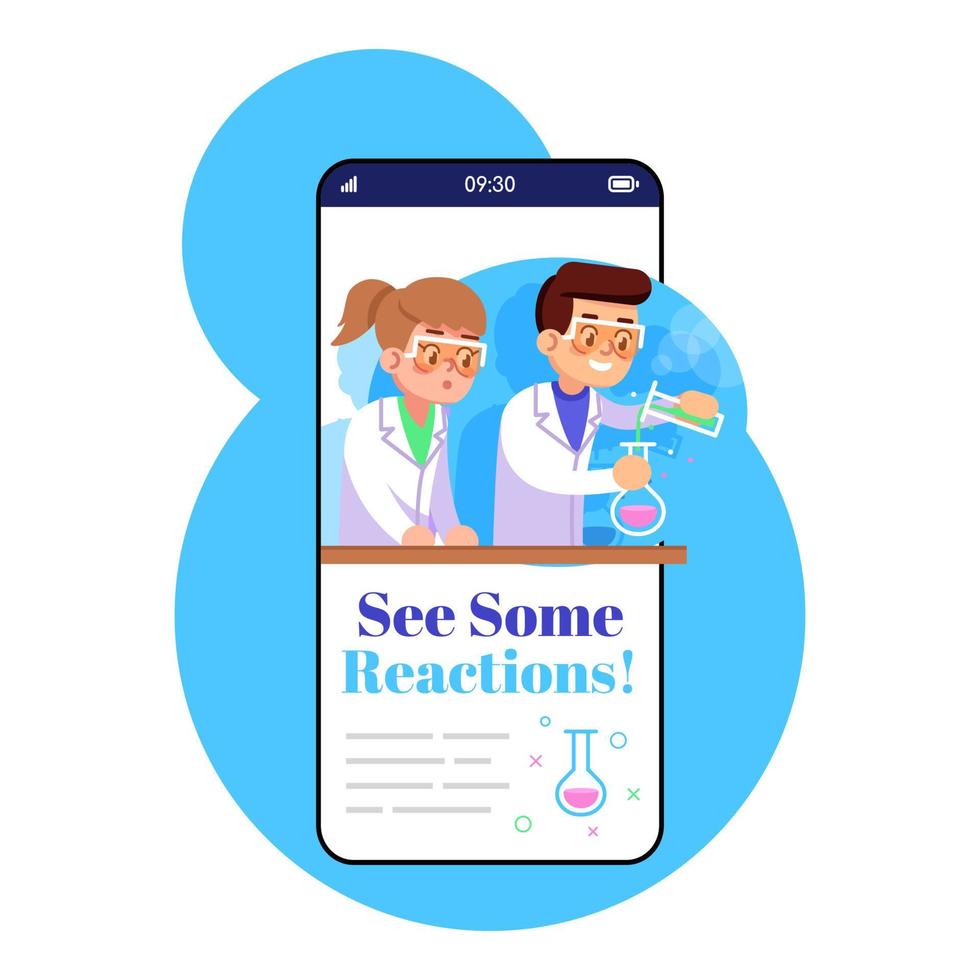 See some reactions smartphone app screen. Mobile phone display with cartoon characters design mockup. Experimental studies. Learning chemistry application telephone interface Pro Vector