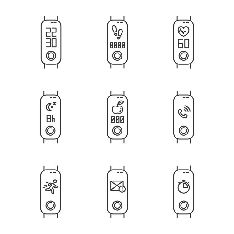 Fitness tracker functions linear icons set. Accessory for health monitoring. Wellness device with notifications and reminders. Thin line symbols. Isolated vector outline illustrations. Editable stroke Pro Vector