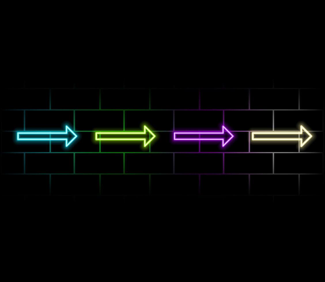 Outline bended neon arrow icon set. Glowing neon curved arrow pointer, bent arrowhead sign. Rounded arrow, turning cursor, bended navigation pointer, rotate motion direction. icon set Pro Vector