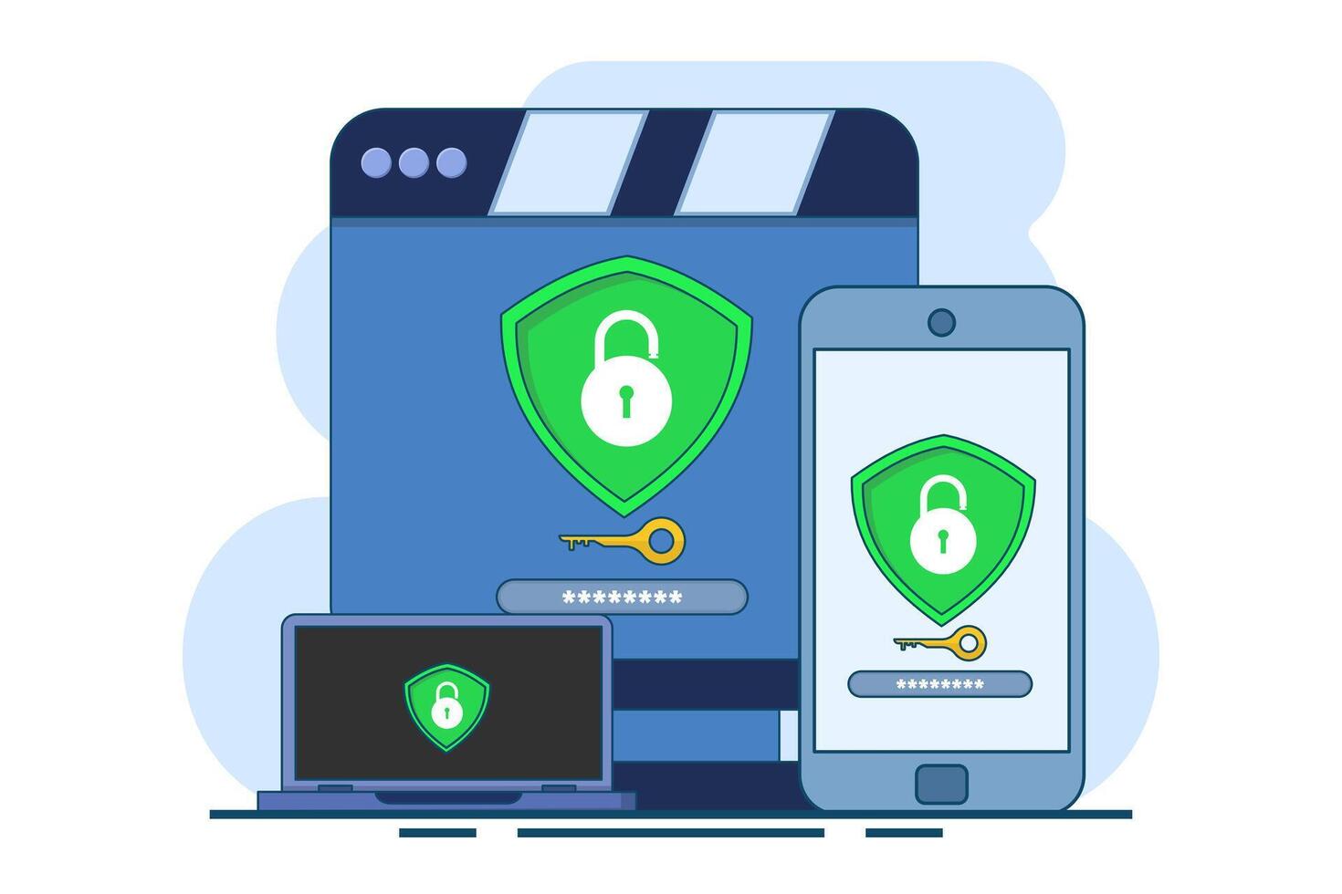 Security software concept that protects multiple digital devices from cyber attacks, Website is protected by access, Data privacy, flat illustration on background. Pro Vector