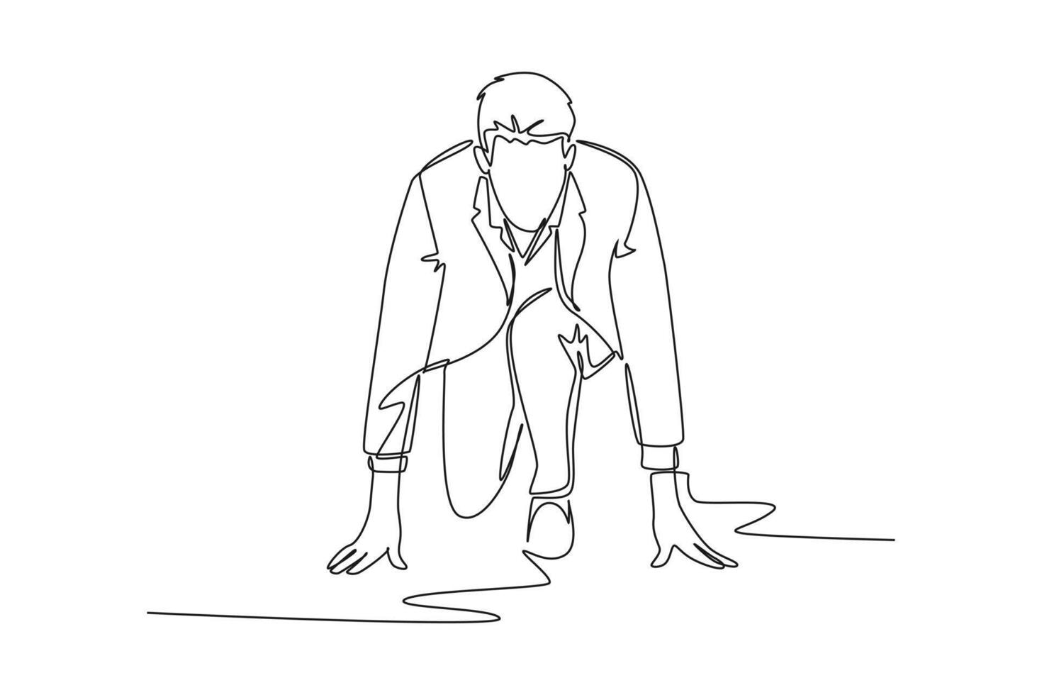 Single one line drawing front view of businessman get ready to sprint run on starting line. Business race to growth up and competition concept. Continuous line draw design graphic illustration Pro Vector