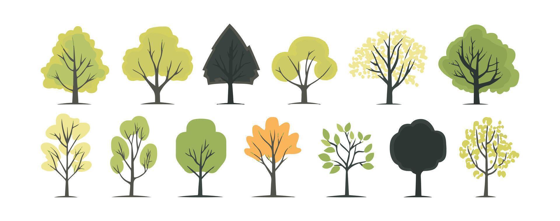 Tree and leaf collection hand drawn flat design element. botanical set of bare trees and ones with leaves and lush Pro Vector