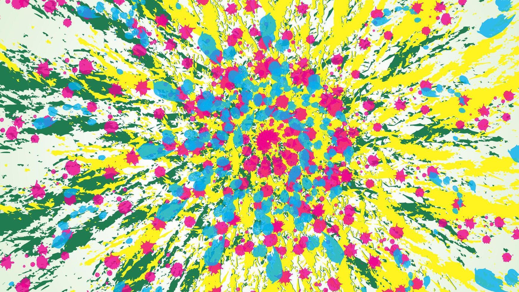 An energetic abstract illustration featuring a burst of vibrant paint splatters radiating from a central point. The chaotic, splattered design contrasts, creating a dynamic and explosive visual effect Pro Vector