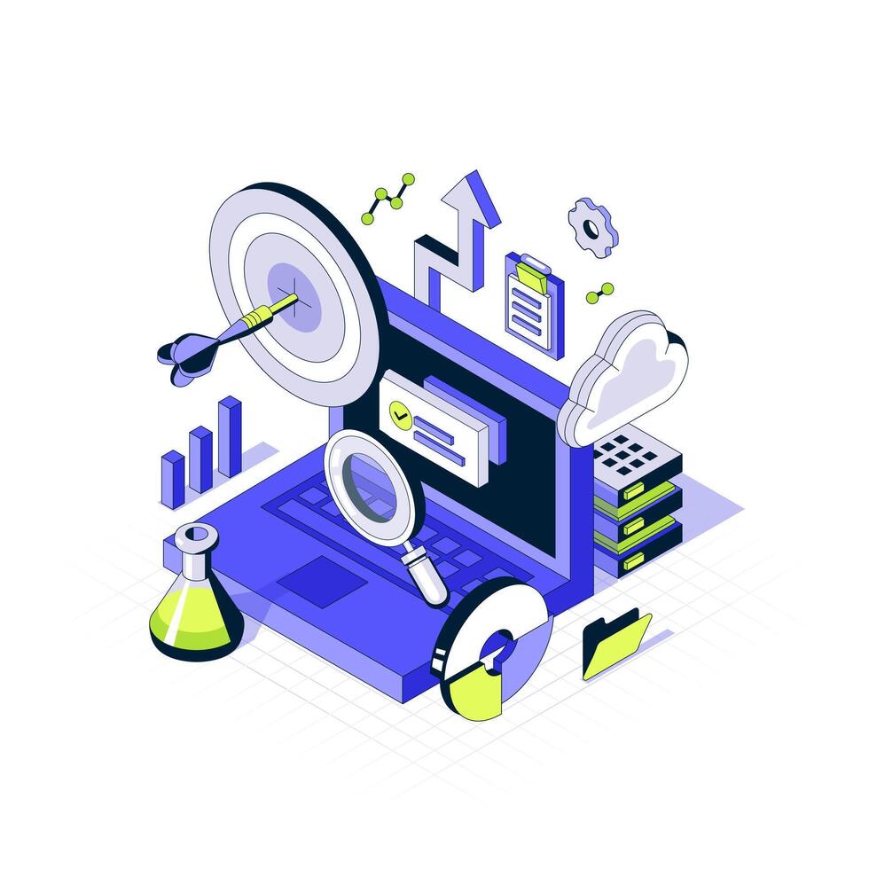 Data Science Isometric concept. A large Dartboard with a dart inside. illustration Pro Vector
