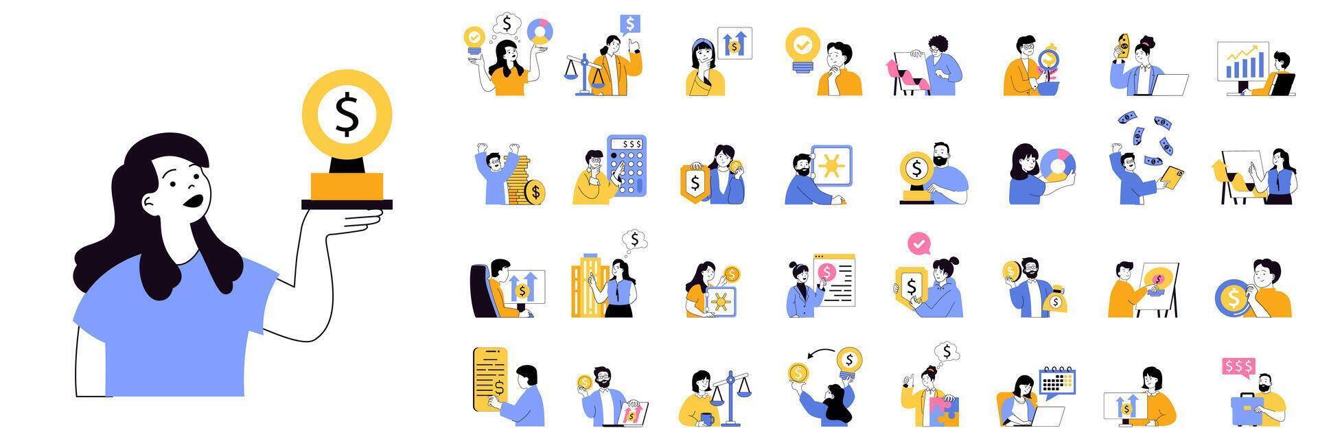 Business concept mega set with character scenes in flat design for web. Bundle situations with people achieving financial goals, making data analysis, managing work processes. illustrations. Pro Vector