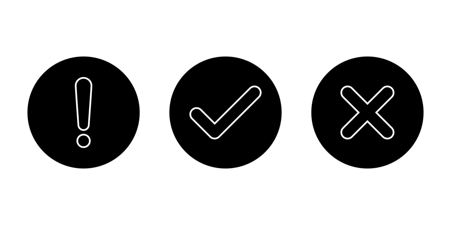 Exclamation mark, tick, and cross line icon on black circle. Warning, checkmark, and x sign symbol Pro Vector