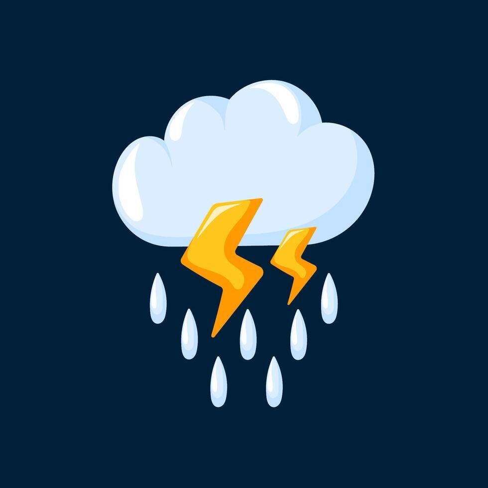 Stormy weather icon featuring a cloud with rain, lightning bolts, and dark background in cartoon style. Design for weather application, forecasts, and meteorological. Pro Vector