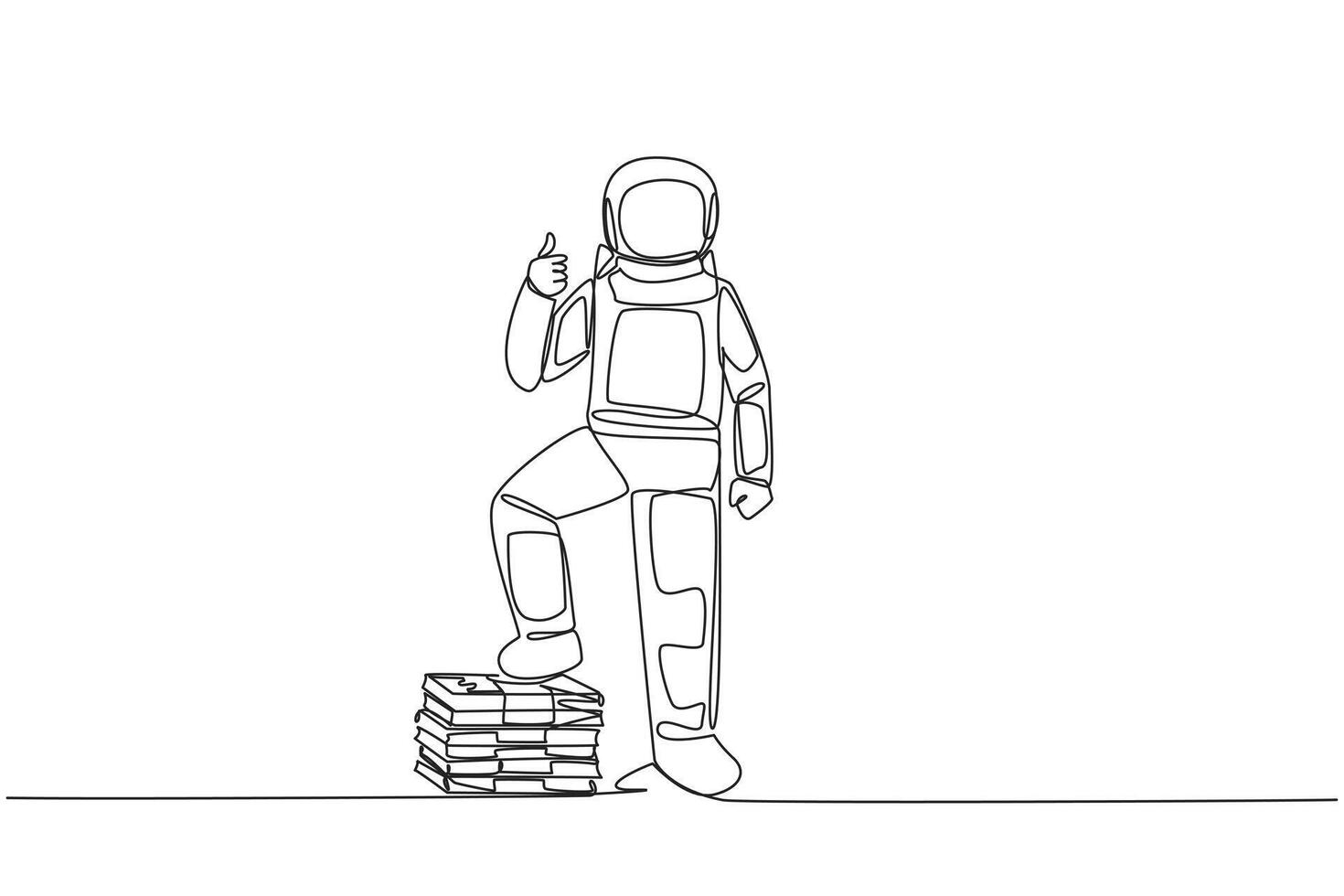 Continuous one line drawing astronaut stands with thumbs up pose and steps on stack of banknotes with one of foot. Get important expedition sponsors. Space. Single line draw design illustration Pro Vector
