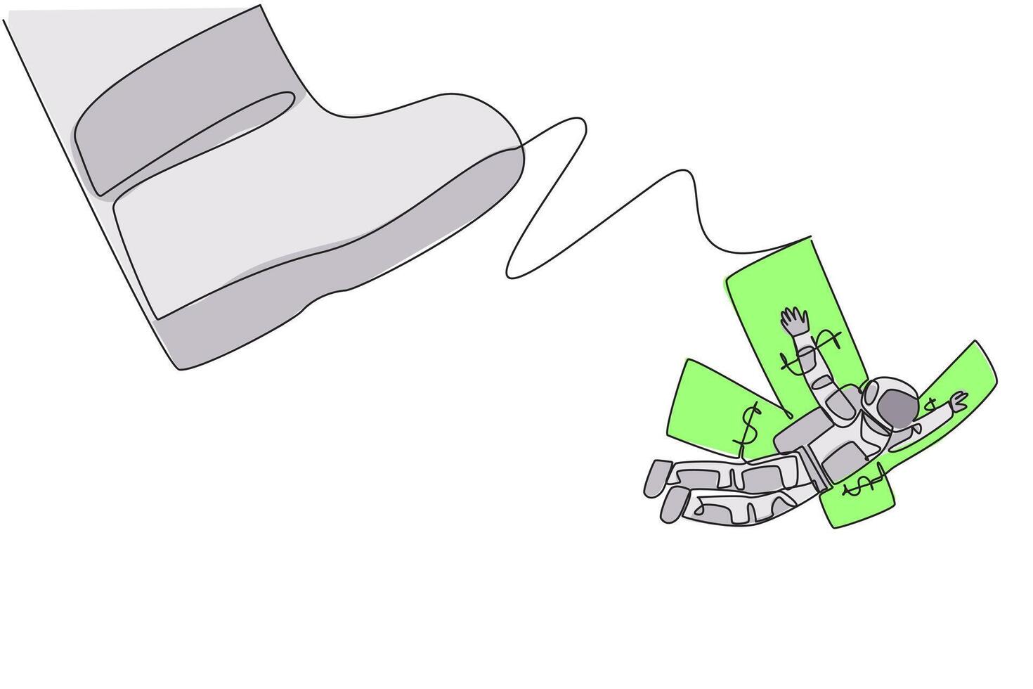Single one line drawing astronaut flying using banknote wings. Test flight to carry out a landing mission on the lunar surface. Cosmic galaxy outer space. Continuous line design graphic illustration Pro Vector