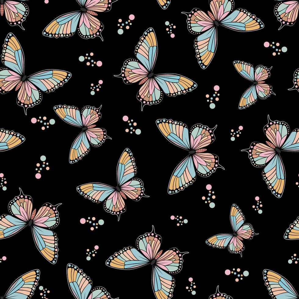 A seamless pattern featuring a butterfly against a black background, inspired by the boho style. Pro Vector
