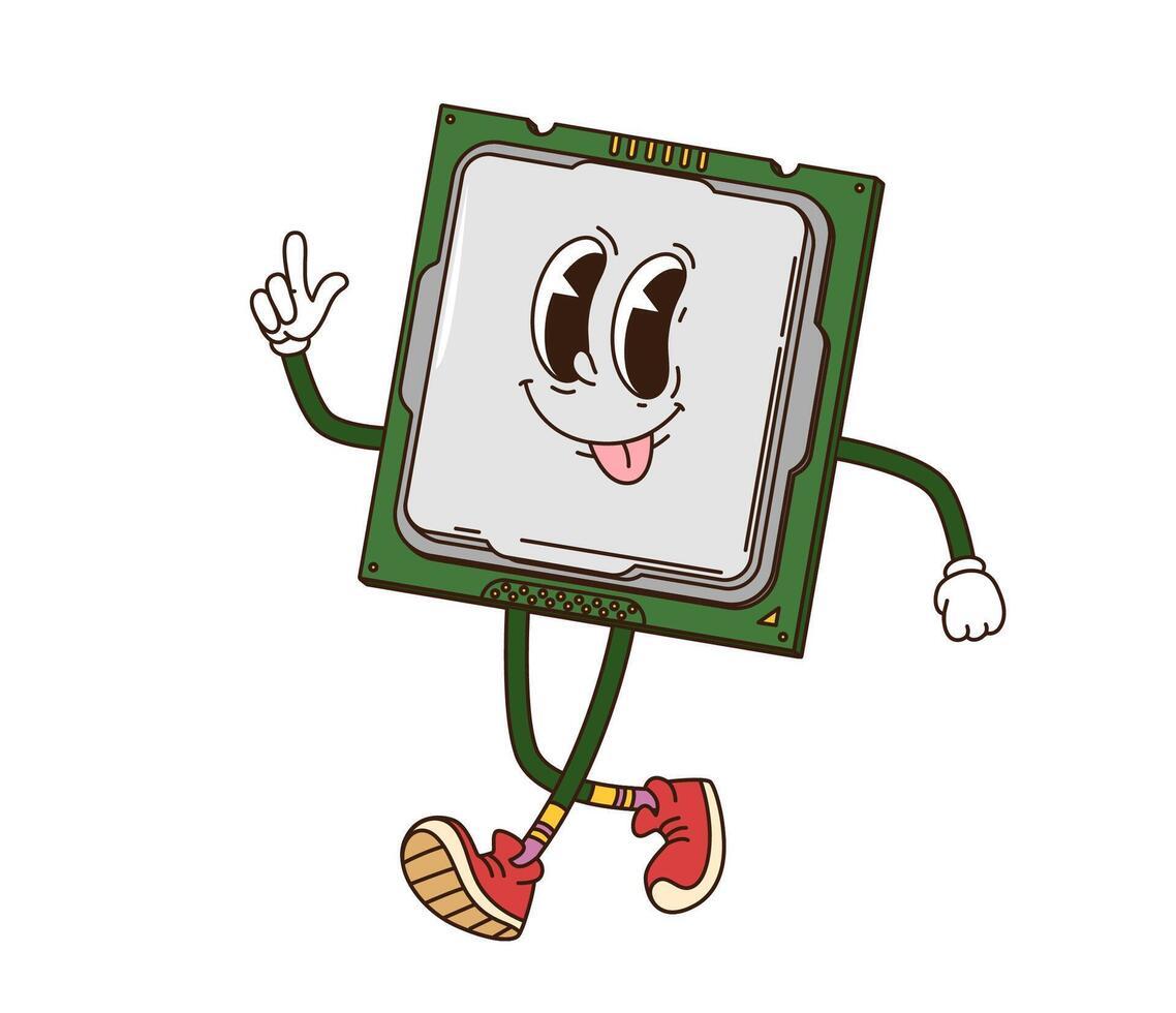 Cartoon groovy computer chip processor character Pro Vector