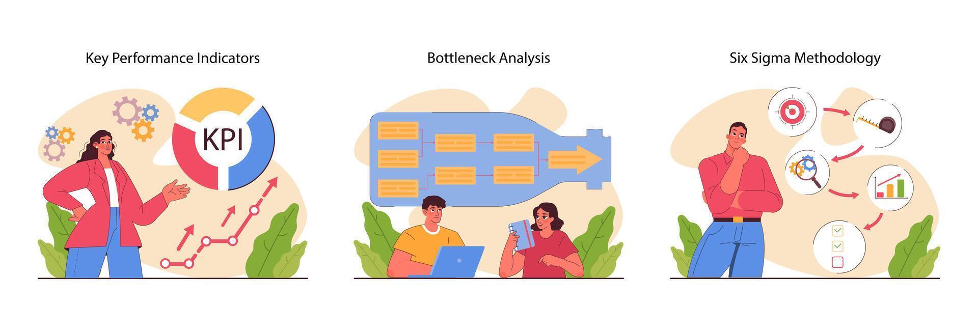 Business processes optimization set. Productive employee with efficient Pro Vector