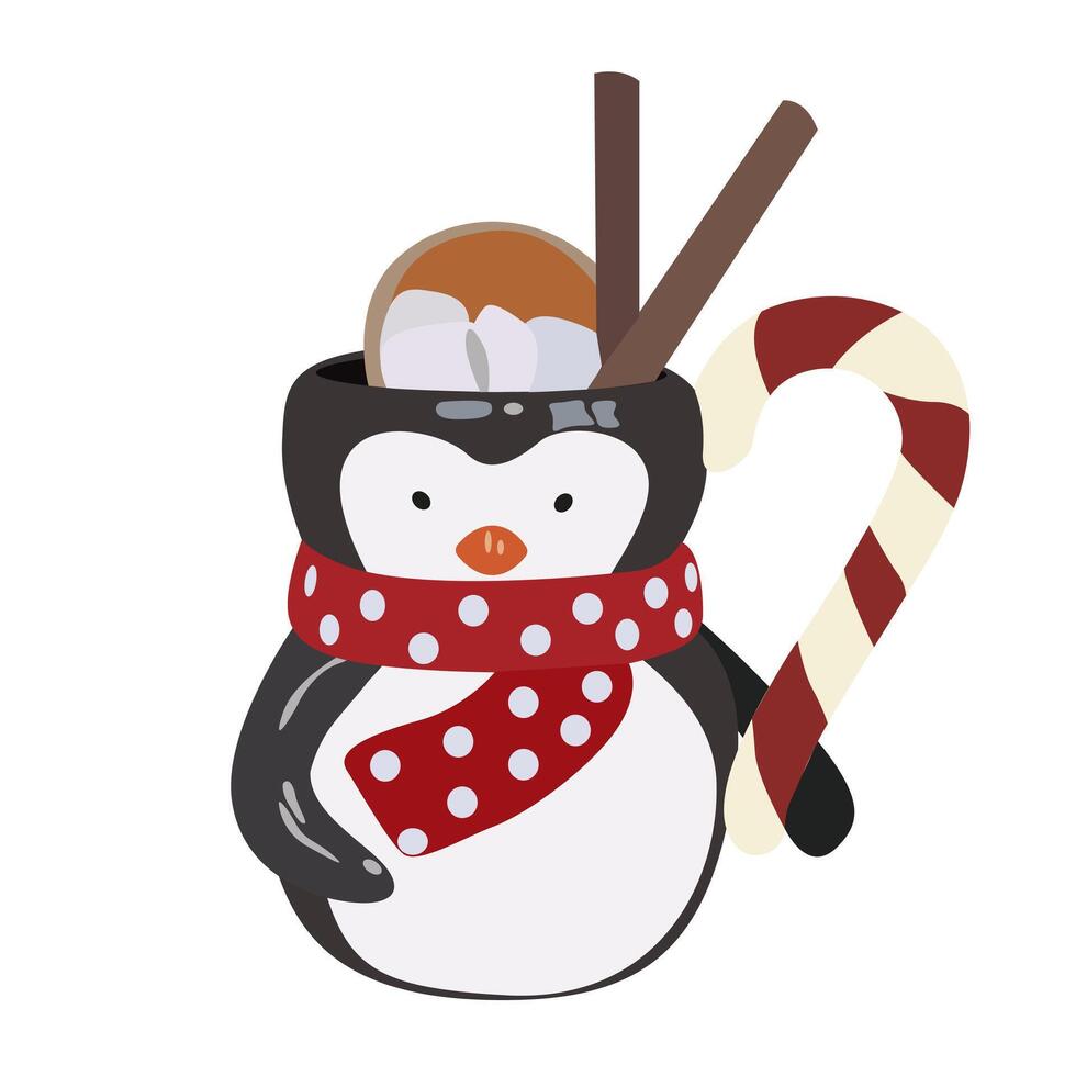 Penguin cup with cocoa, marshmallows and cinnamon sticks. Merry Christmas and Happy New Year greeting card. Penguin character in a flat style on a white background Pro Vector