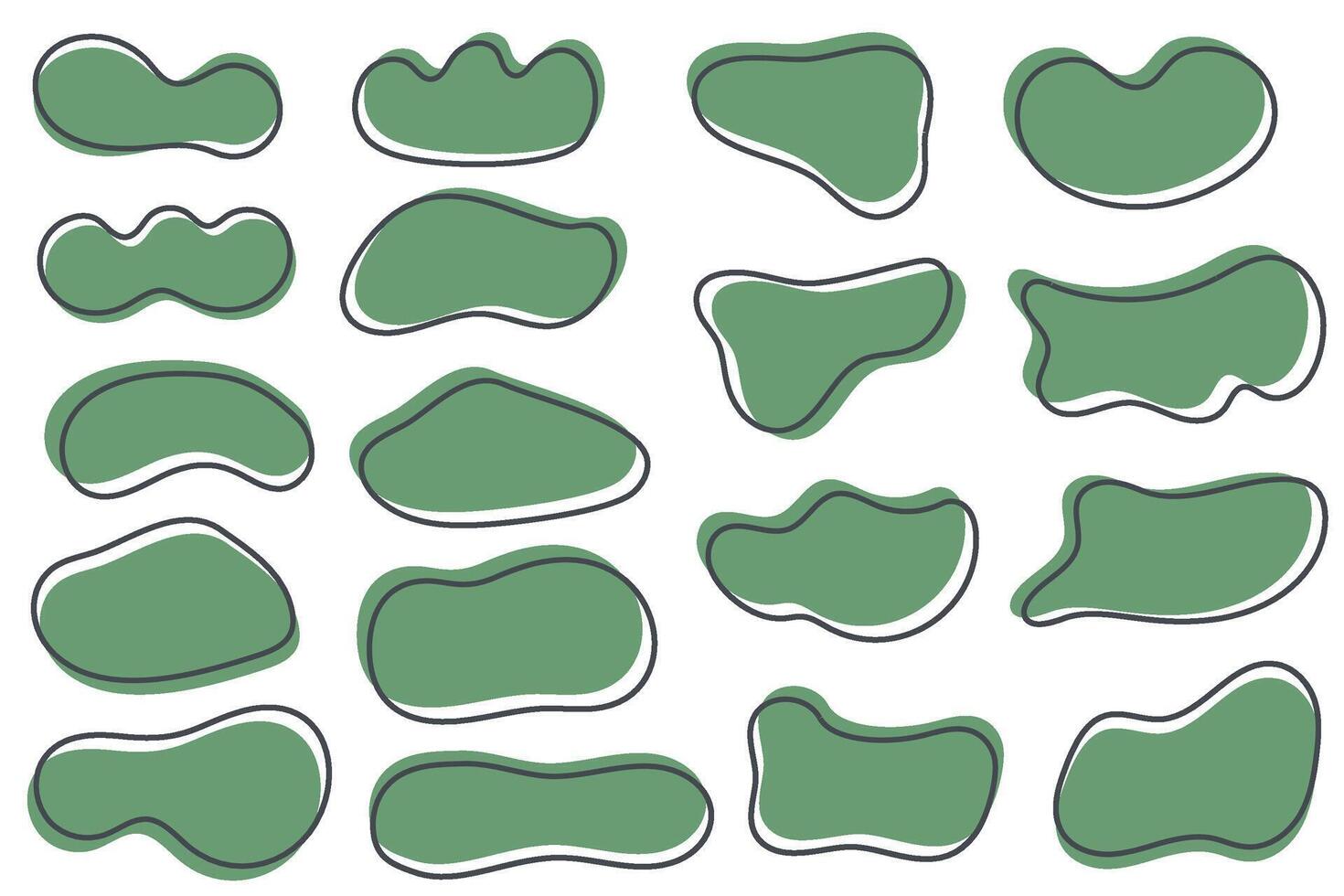 Irregular organic blobs set. Abstract round liquid forms on white background. Random fluid bubbles and simple amoeba wavy splashes. Green stain blots and curvy asymmetric stains Pro Vector