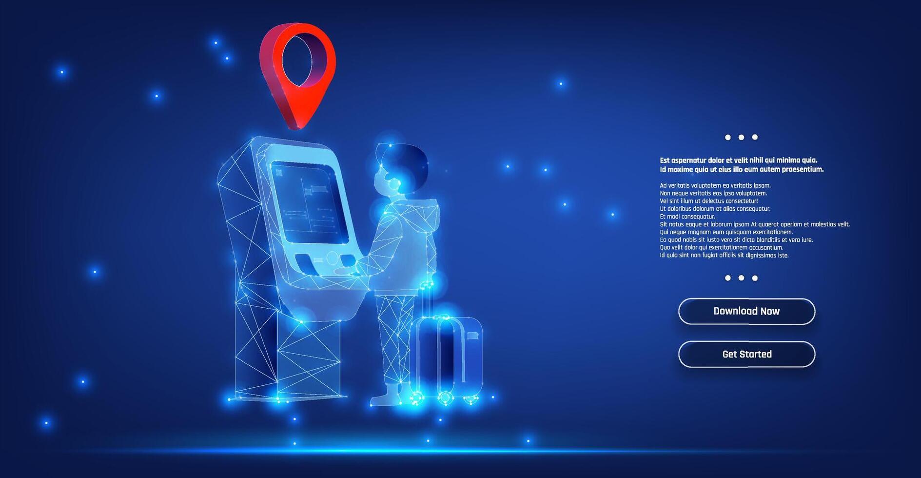 A traveler using a digital kiosk for navigation assistance in a modern airport setting at night Pro Vector