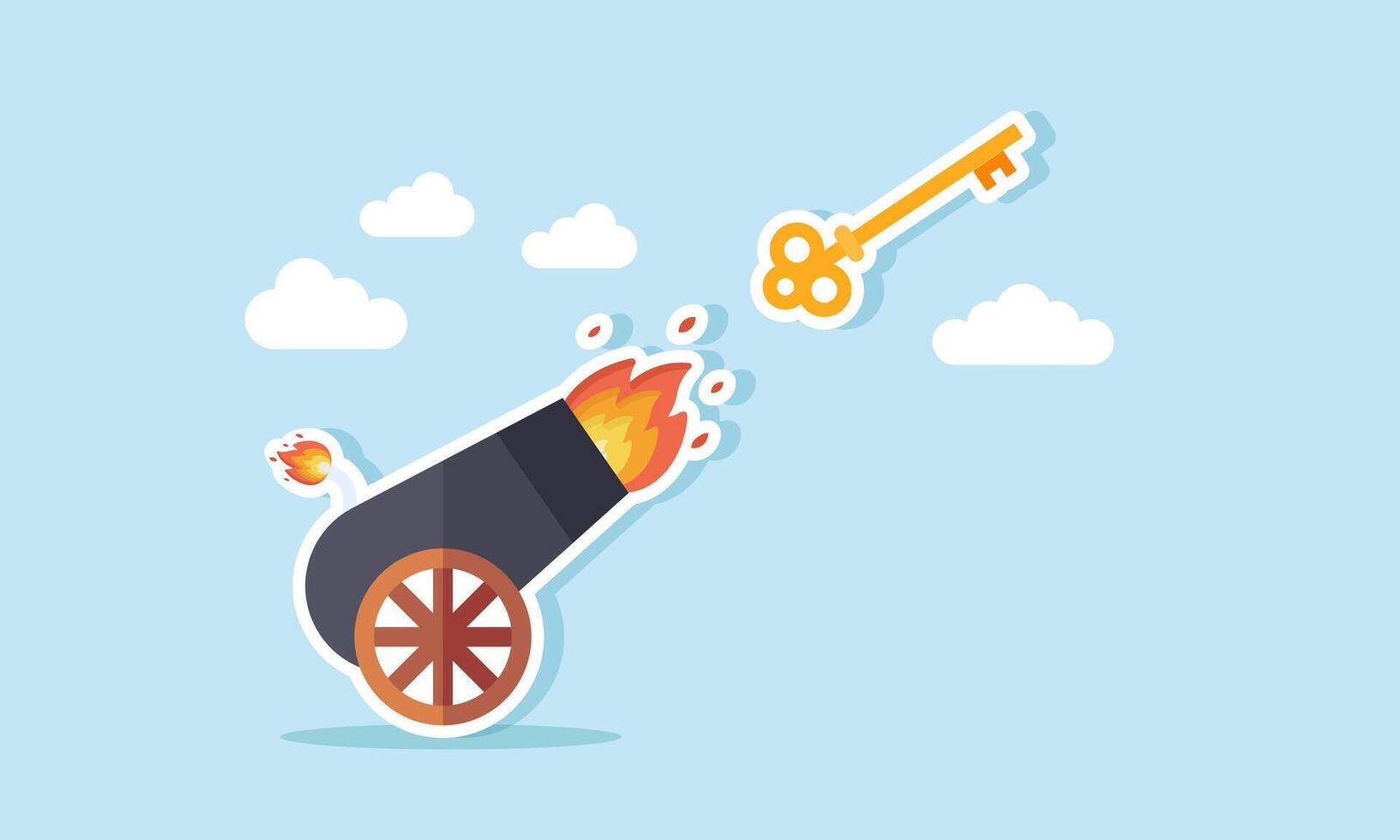 A cannon firing a golden key, illustration of A problem solved in a structured and elegant manner Pro Vector