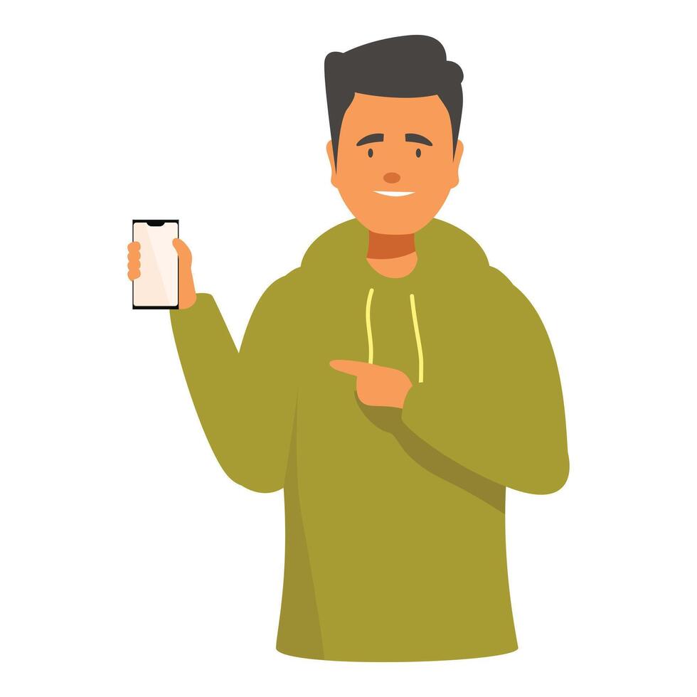 Smiling young man showing smartphone screen and pointing at it Pro Vector