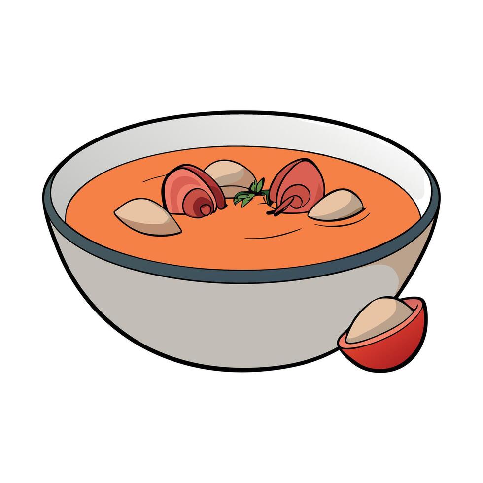 Close up of a bowl of tomato clam chowder with shellfish and bacon on the table With copyspace for t Pro Vector