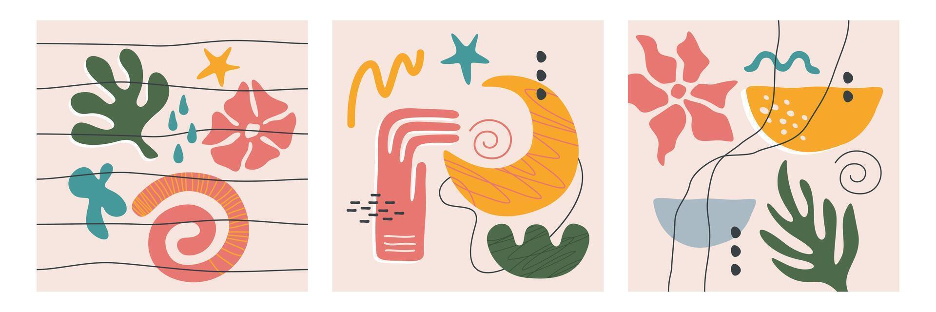 set of contemporary cards with abstract summer nature elements. Poster collection with organic geometric shapes, lines, doodle freeform objects. Hand drawn trendy basic simple figures and forms Pro Vector