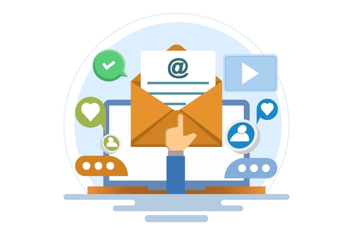 Marketing strategy concepts using email, Email campaigns, Sending emails to potential customers, Newsletter marketing, Sharing advertising messages on social media, Internet network communication. Pro Vector