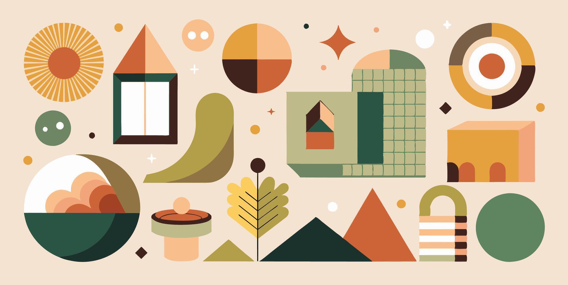 A collection of geometric shapes and objects set against a beige background Pro Vector