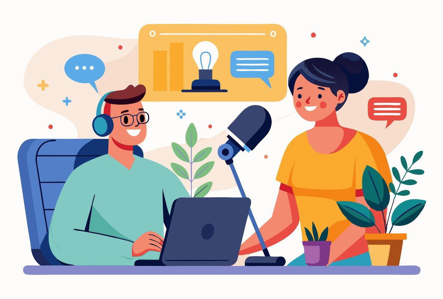 Engaging podcast interview scene with hosts discussing ideas in a creative studio setting Pro Vector