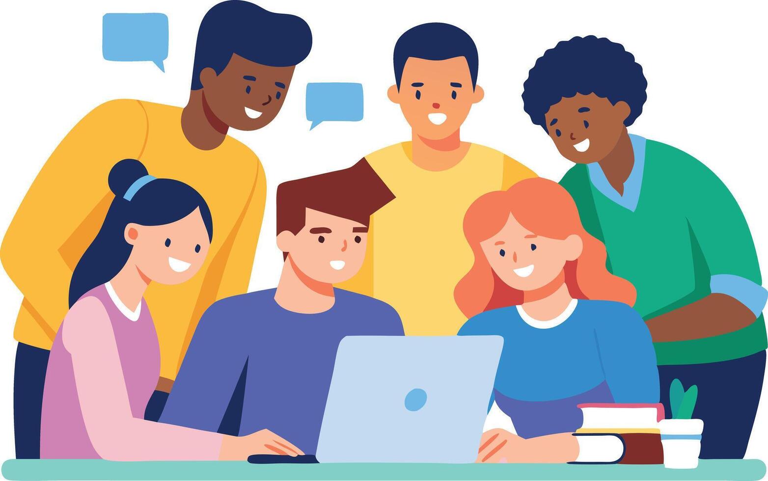 Diverse group of students collaborating on a project using a laptop Pro Vector