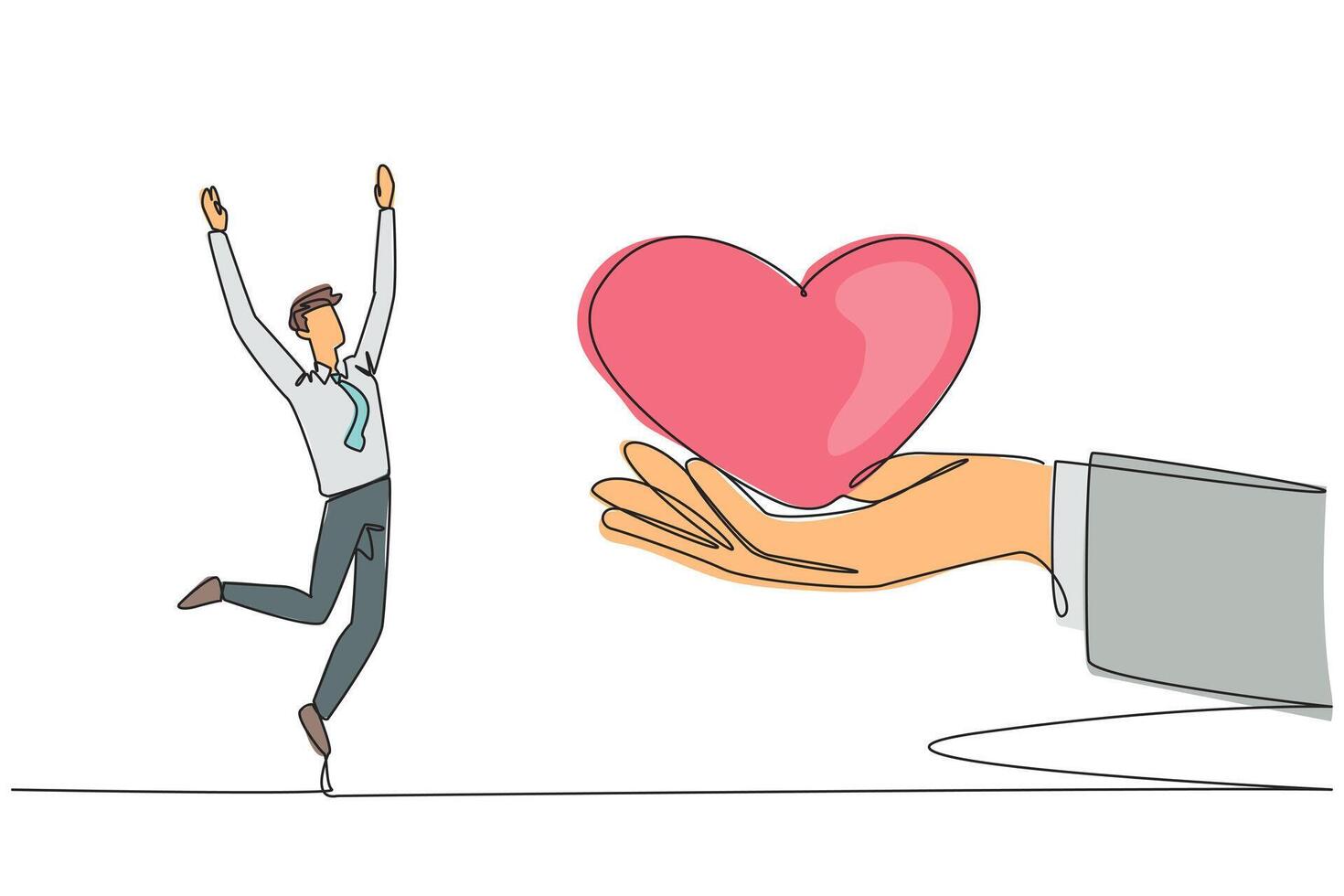 Single one line drawing the businessman is happy to get love from the giant hand. Doing business using heart. Get as expected. Work smarter than before. Continuous line design graphic illustration Pro Vector