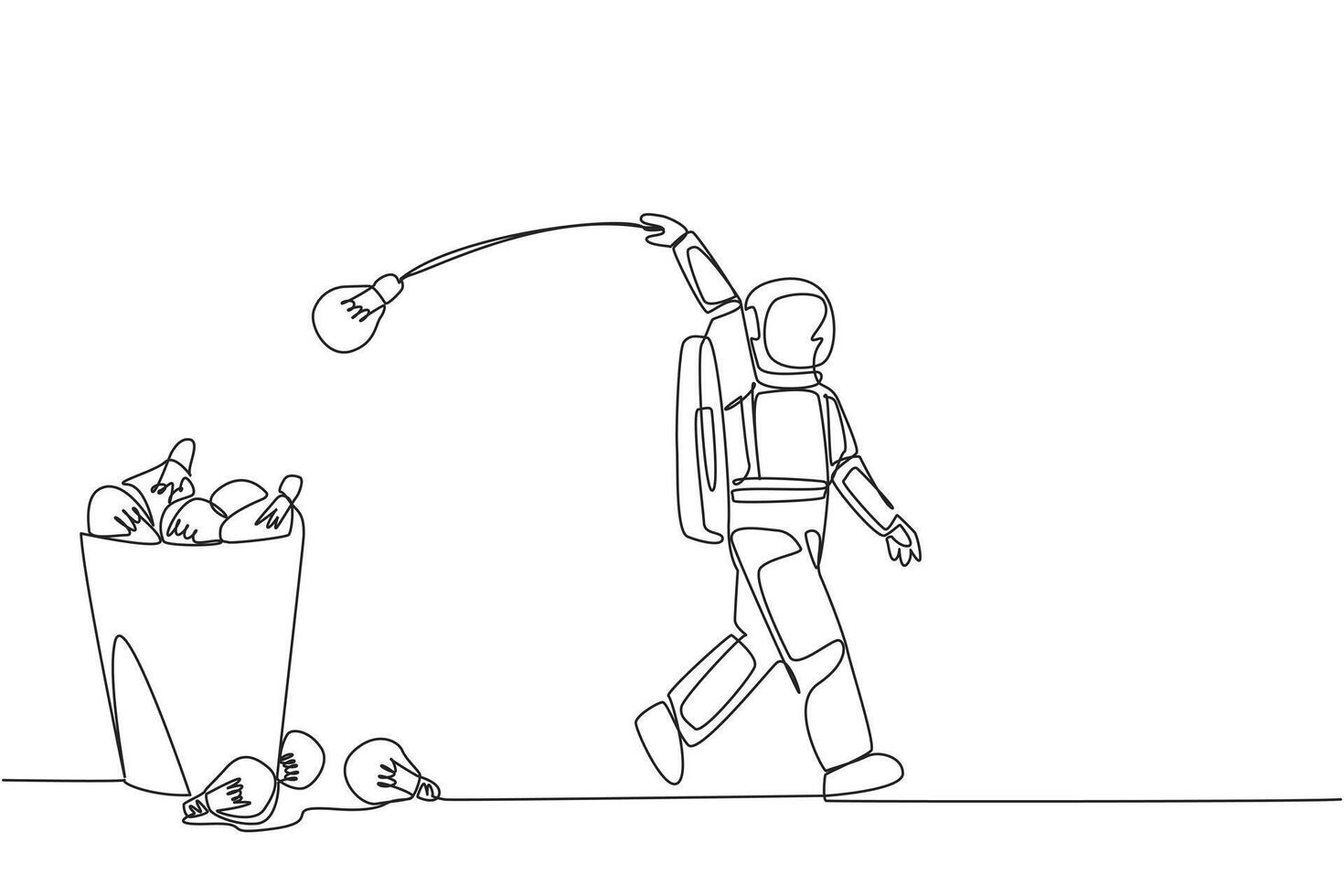 Single one line drawing astronaut walking throwing light bulbs into trash can. Throwing out ideas to convey during space expeditions. Galaxy outer space. Continuous line design graphic illustration Pro Vector