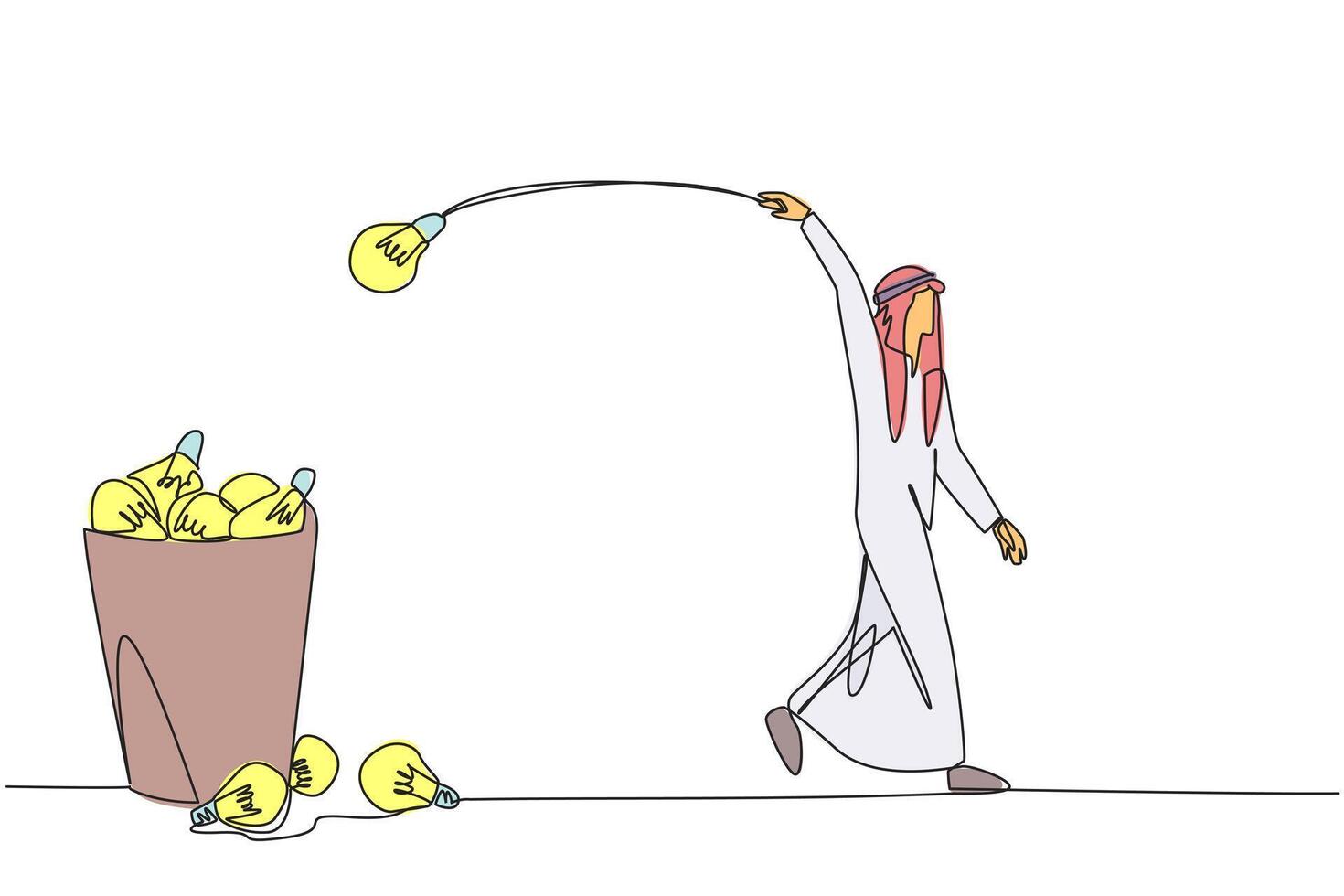 Continuous one line drawing Arabian businessman walking throwing lightbulb into the trash can. Being under pressure. Don't have the best ideas. No solution. Single line draw design illustration Pro Vector