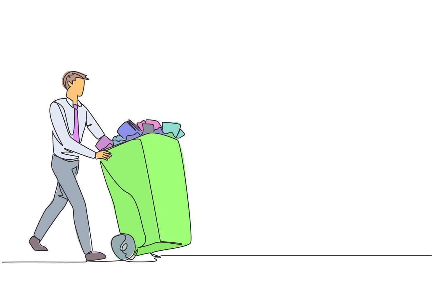 Continuous one line drawing businessman pushing a trash can filled with wads of paper. Throw away administrative records that are no longer needed. Delete. Single line draw design illustration Pro Vector