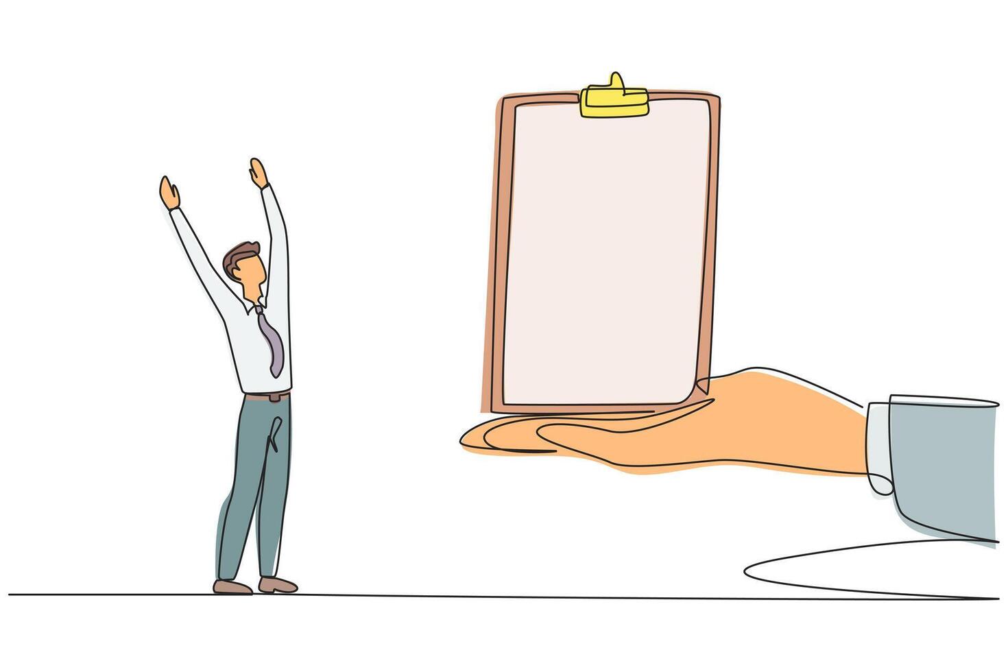 Continuous one line drawing the businessman was excited to get the clipboard from the giant hand. Important prize. Can do reports anywhere. Make checklist. Single line draw design illustration Pro Vector
