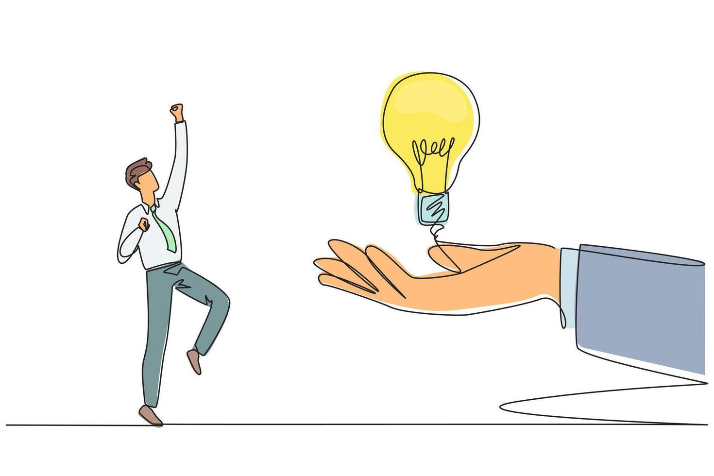Single one line drawing the businessman is excited to get a lightbulb from a giant hand. Sharing is caring. Getting the best innovation for the business. Continuous line design graphic illustration Pro Vector