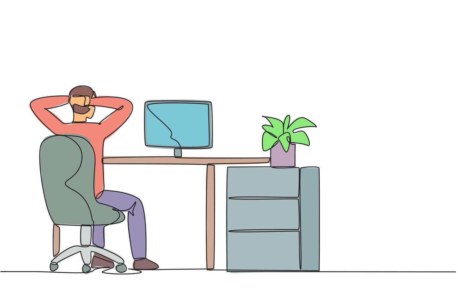 Single one line drawing man sitting in chair with his hands holding the back of head. Seen from behind. Work overtime on weekends. Remote work. Monitoring. Continuous line design graphic illustration Pro Vector