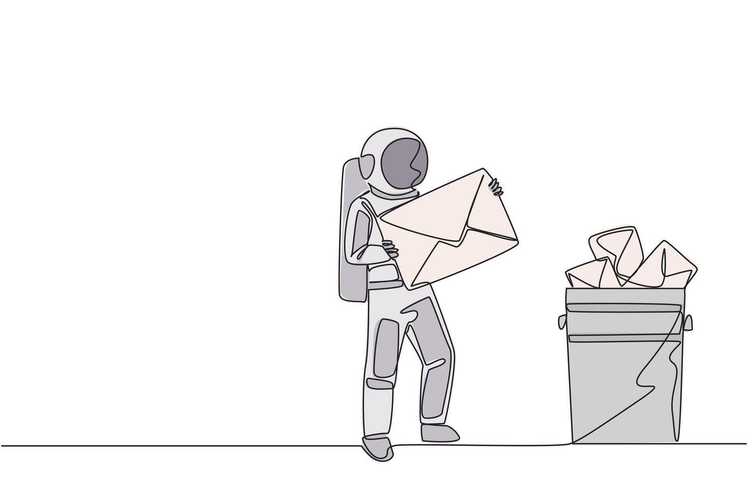 Continuous one line drawing astronaut throw large envelope in the trash. Avoid continuous incoming email attacks. Deleting. Space man cosmic galaxy concept. Single line draw design illustration Pro Vector