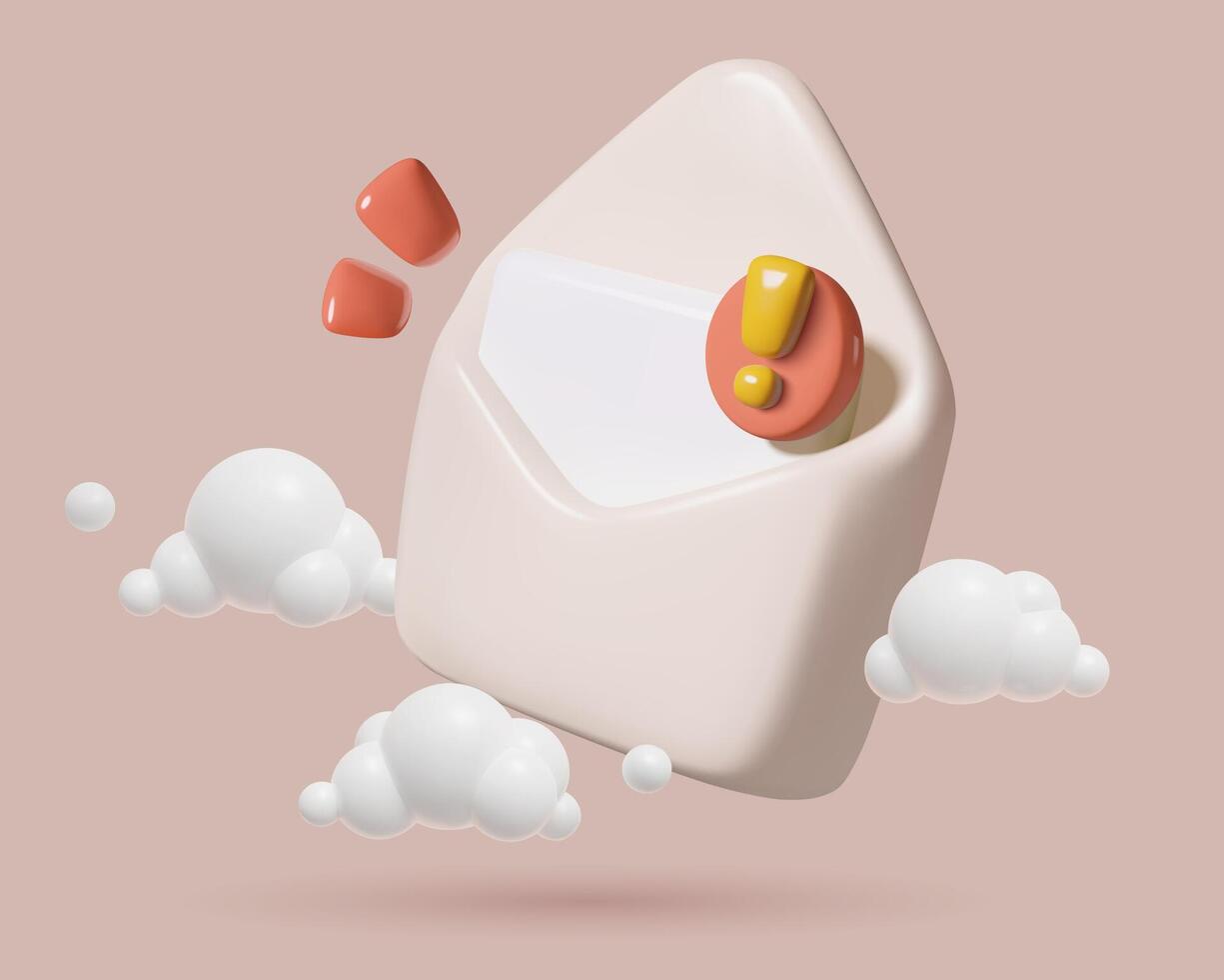 Mail envelope 3d icon with exclamation point opened paper envelope in clouds with important message Pro Vector