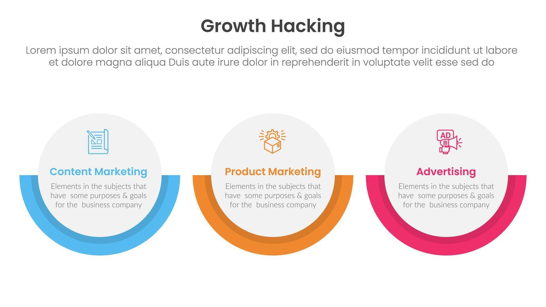 growth hacking infographic 3 point with big circle horizontal layout for slide presentation vector
