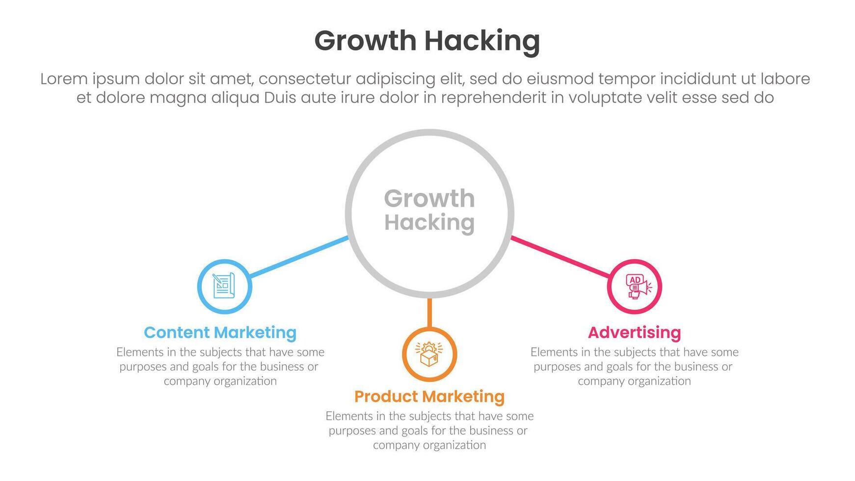 growth hacking infographic 3 point with big outline circle and connected line content for slide presentation Pro Vector