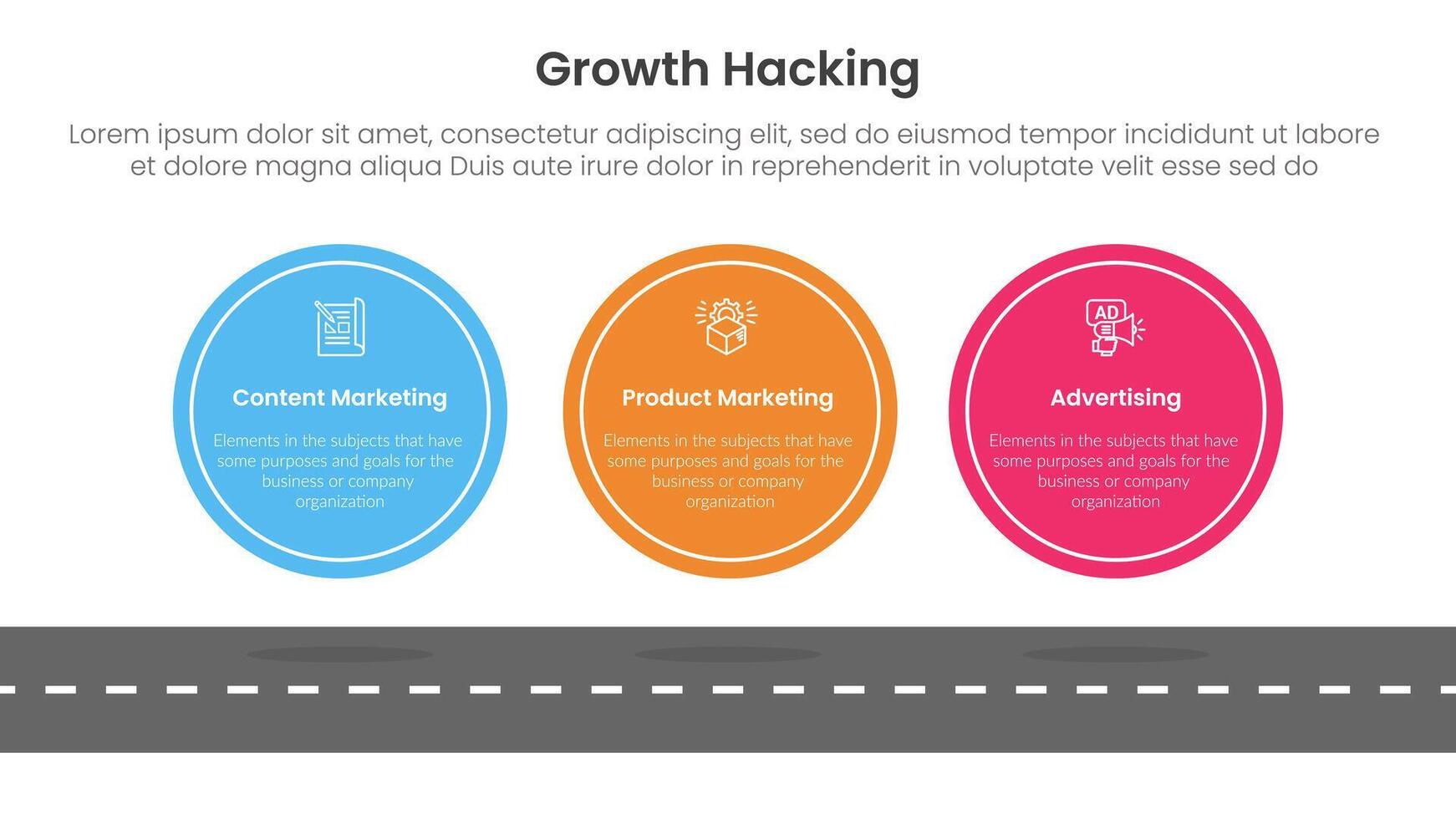 growth hacking infographic 3 point with big circle symmetric horizontal on top of roadway for slide presentation vector