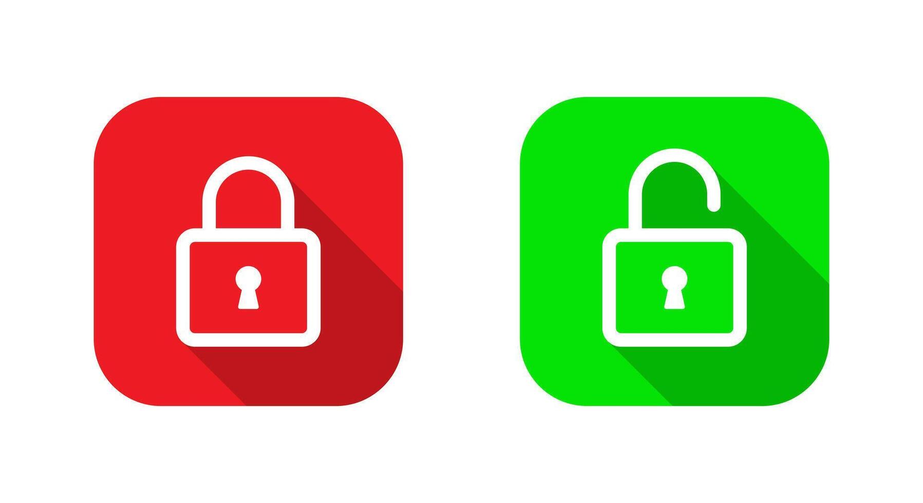 Lock and unlock padlock icon on square background. Padlock with long shadow Pro Vector