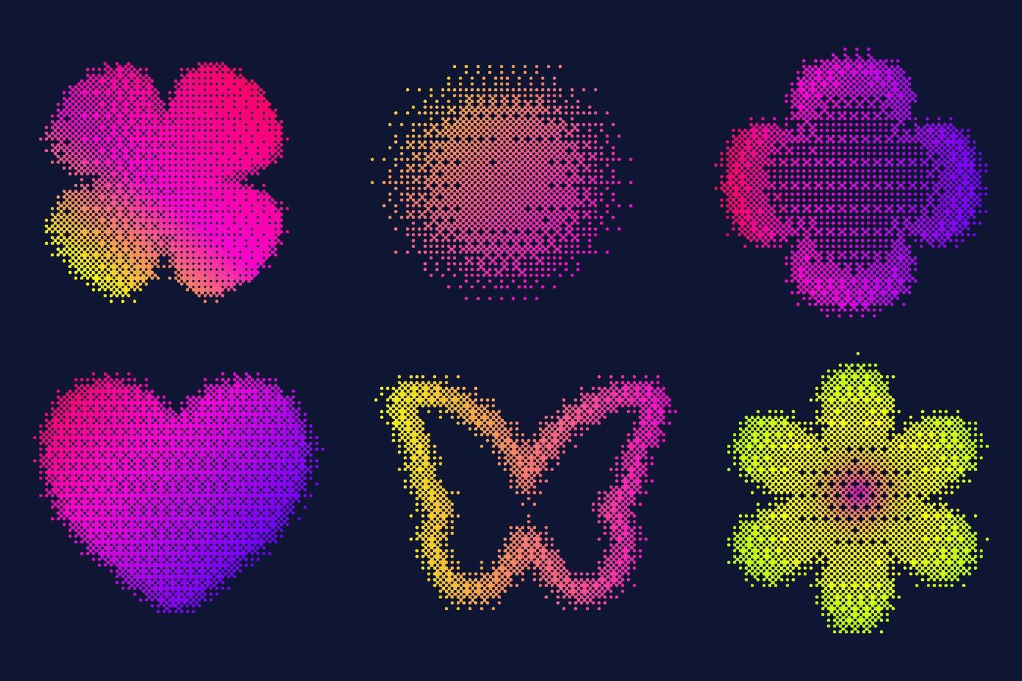 Pixel pattern shapes. Textured heart flower and star with bitmap Y2k dither gradient. Retro butterfly with old computer game graphic effect. Halftone grunge illustration Pro Vector
